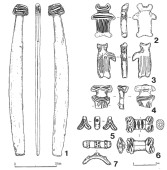 完全な形で土壙墓に副葬された唯一の例が札苅遺跡で発見されているだけで(第42図1)、多くの場合には破片で出土する。第42図2~4のような小型な板状土偶も札苅遺跡などで多出し、多くの場合、首、足、腕や胴などを故意に折った形跡がみられ、土偶の身体破損にともなった儀礼があったと考えられる。