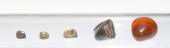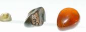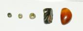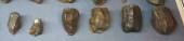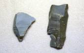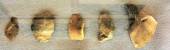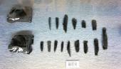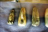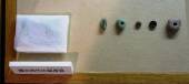 その脇にカンラン岩製の垂飾1点と玉が3点、琥珀製の垂飾1点、それに頁岩製の石刃核4点、石刃1点、細石刃2点、剥片2点が置かれていました。