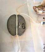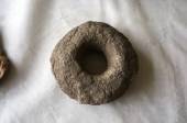 紡錘車は、 繊維から糸をつむぎ出す道具で、繊維の端を棒の端に固定し、 本体をくるくる回転させることで繊維をねじり、糸を作りだします。